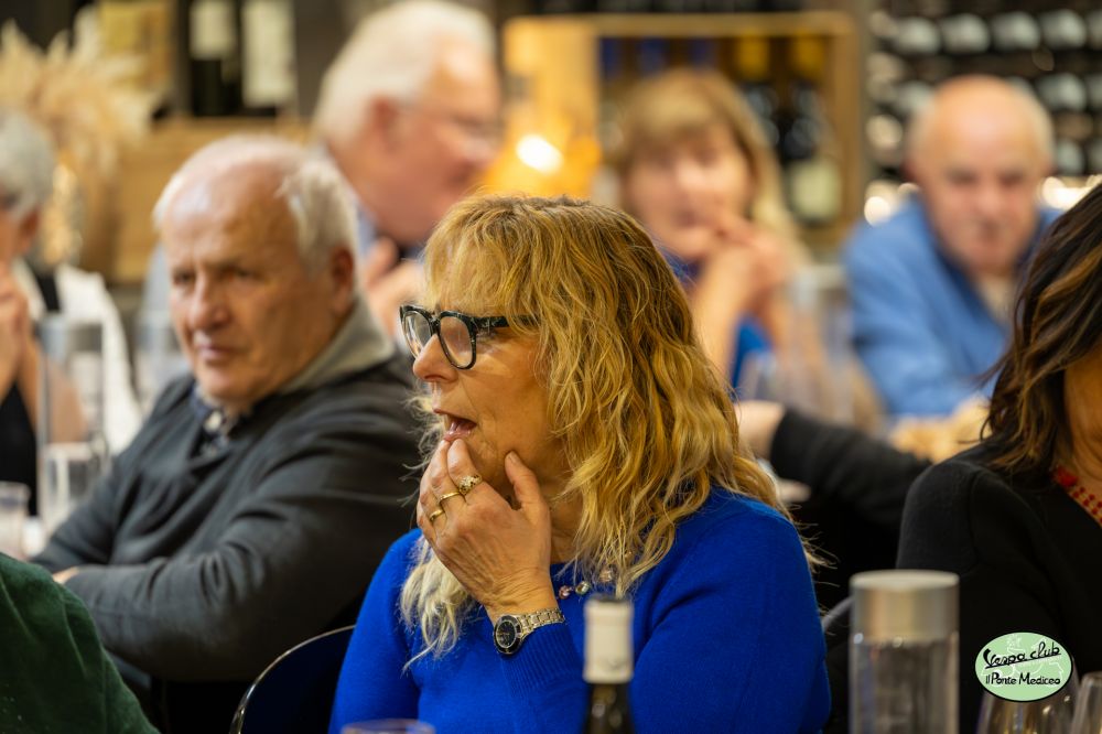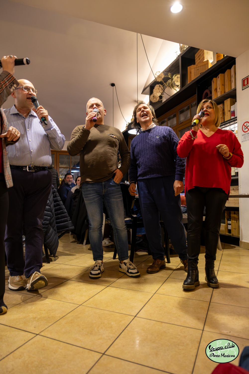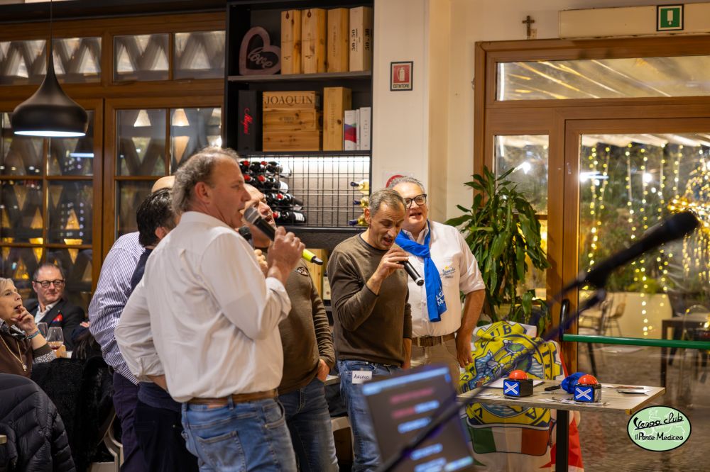 La "cena in casa" non è un eufemismo perché ormai il ristorante "La Casa Rossa" è un po' casa nostra, essendo spesso base di partenza, sosta per aperitivo, sede del pranzo di raduni e della cena di fine anno. La serata è iniziata con un aperitivo di benvenuto seguito dalle varie portate semore gustose e abbondanti. Durante la cena non è mancato il divertimento, la musica di Maurino Live ci ha accompagnato e intrattenuto tutta la sera con giochi di abilità e esibizioni canore di karaoke, hanno cantato persino i sindaci e Assessora. Il consueto regalo di natale quest'anno è stato un foulard azzurro con il logo del vespaclub, consegnato daun elfo e una renna....