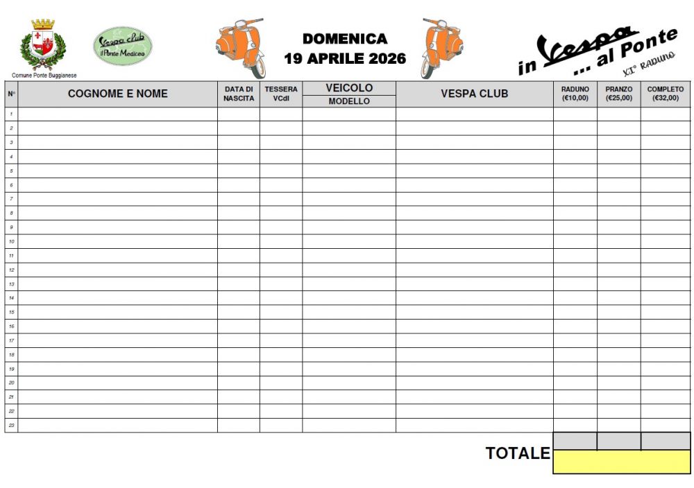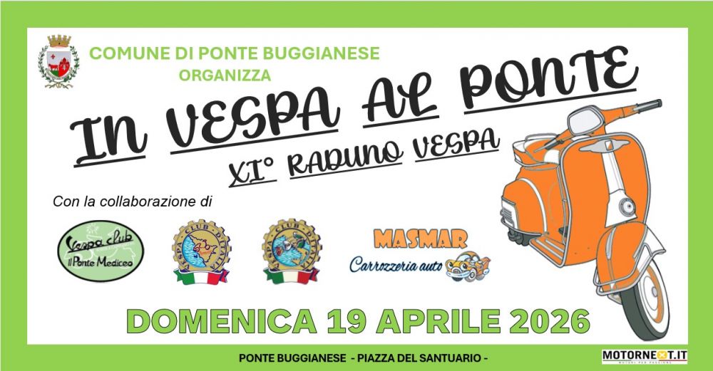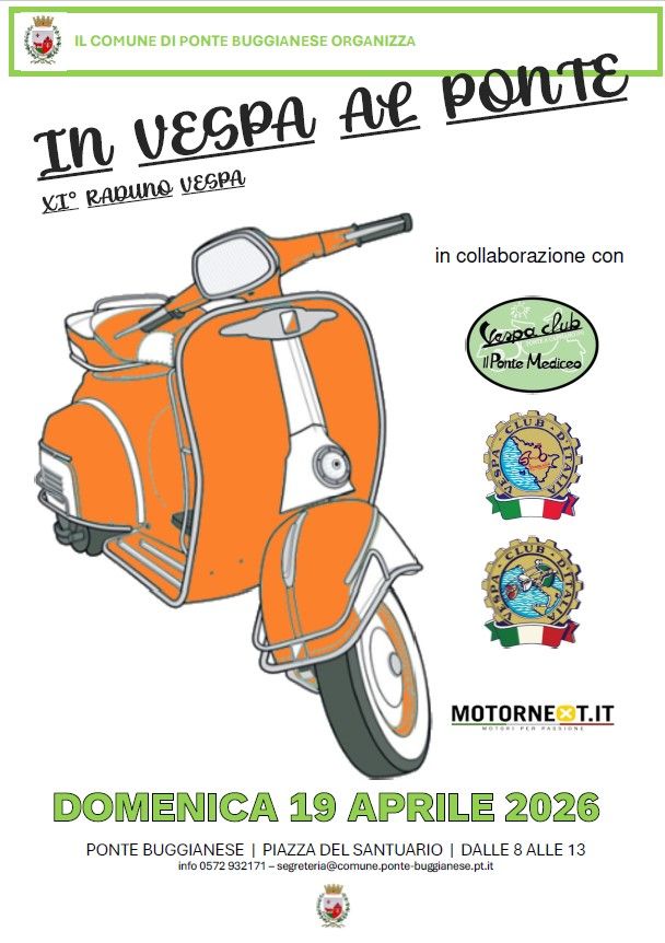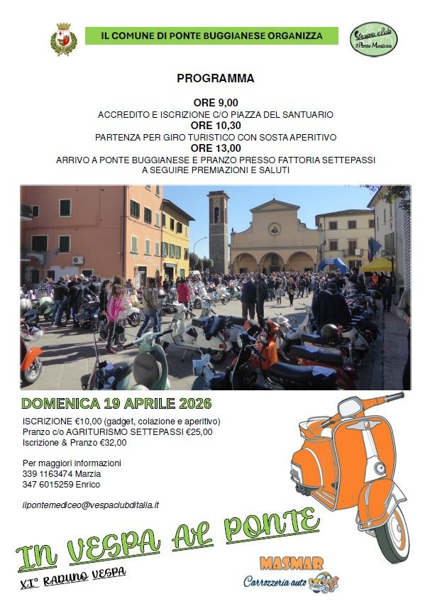 Una tradizione che si ripete da 11 anni. Un bel raduno organizzato dal Comune di Ponte Buggianese con la collaborazione del Vespa club Il Ponte Mediceo. Praticamente agli inizi della stagione vespistica, In Vespa al Ponte stimola la voglia di ricominciare e di ritrovarsi in sella. Dopo il ritrovo e la colazione in piazza, il giro (con sosta aperitivo) per i bellissimi territori della Val di Nievole terminerà alla Fattoria Settepassi, dove potremo gustare un bel pranzo e dove, dopo le premiazioni, ci saluteremo dandoci appuntamento al prossimo raduno.